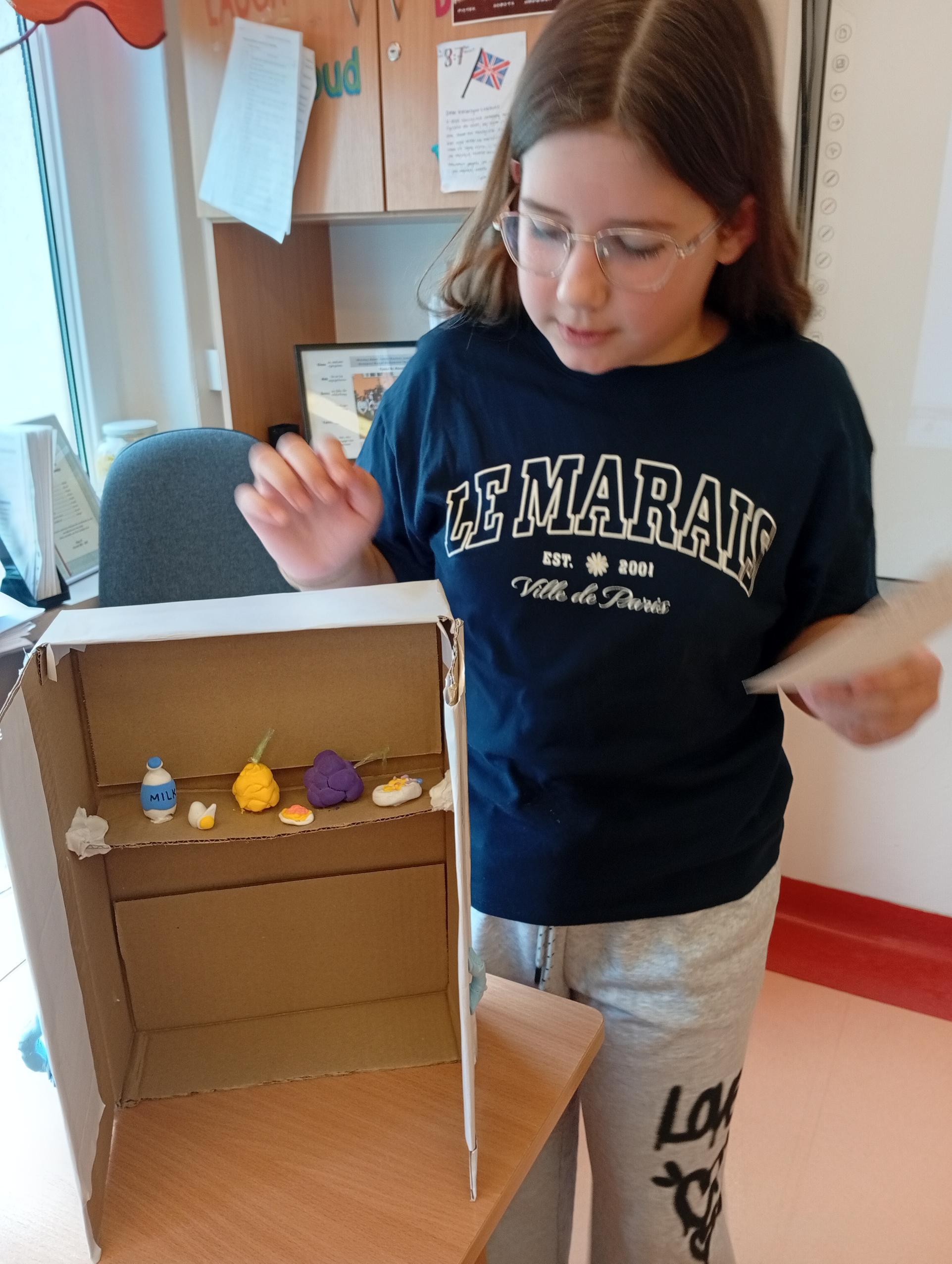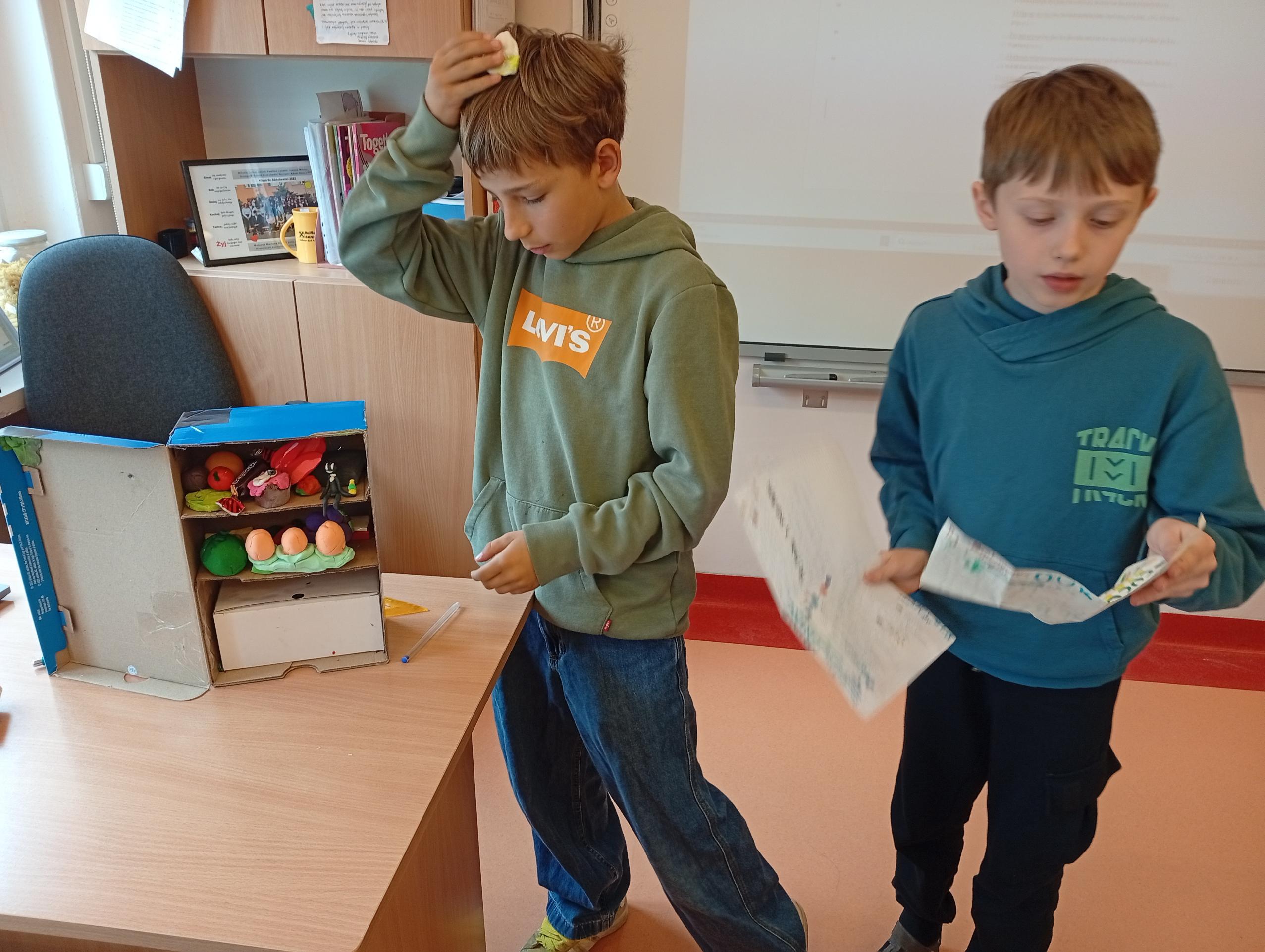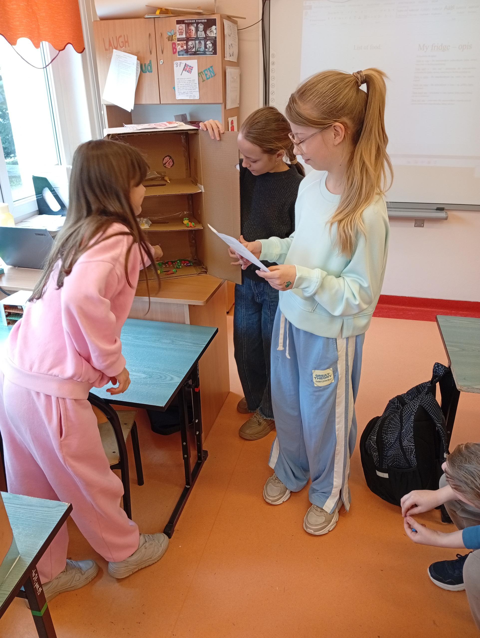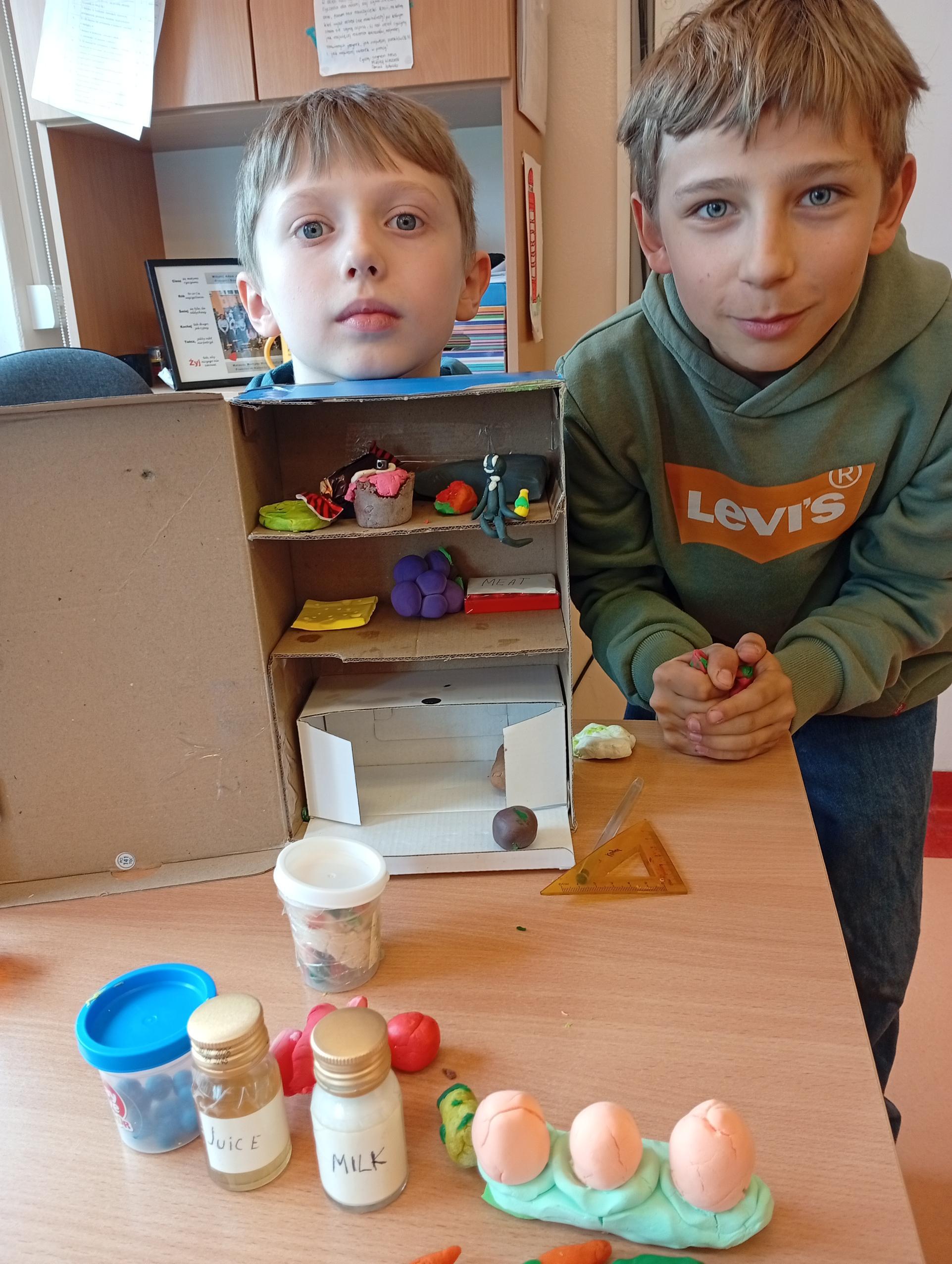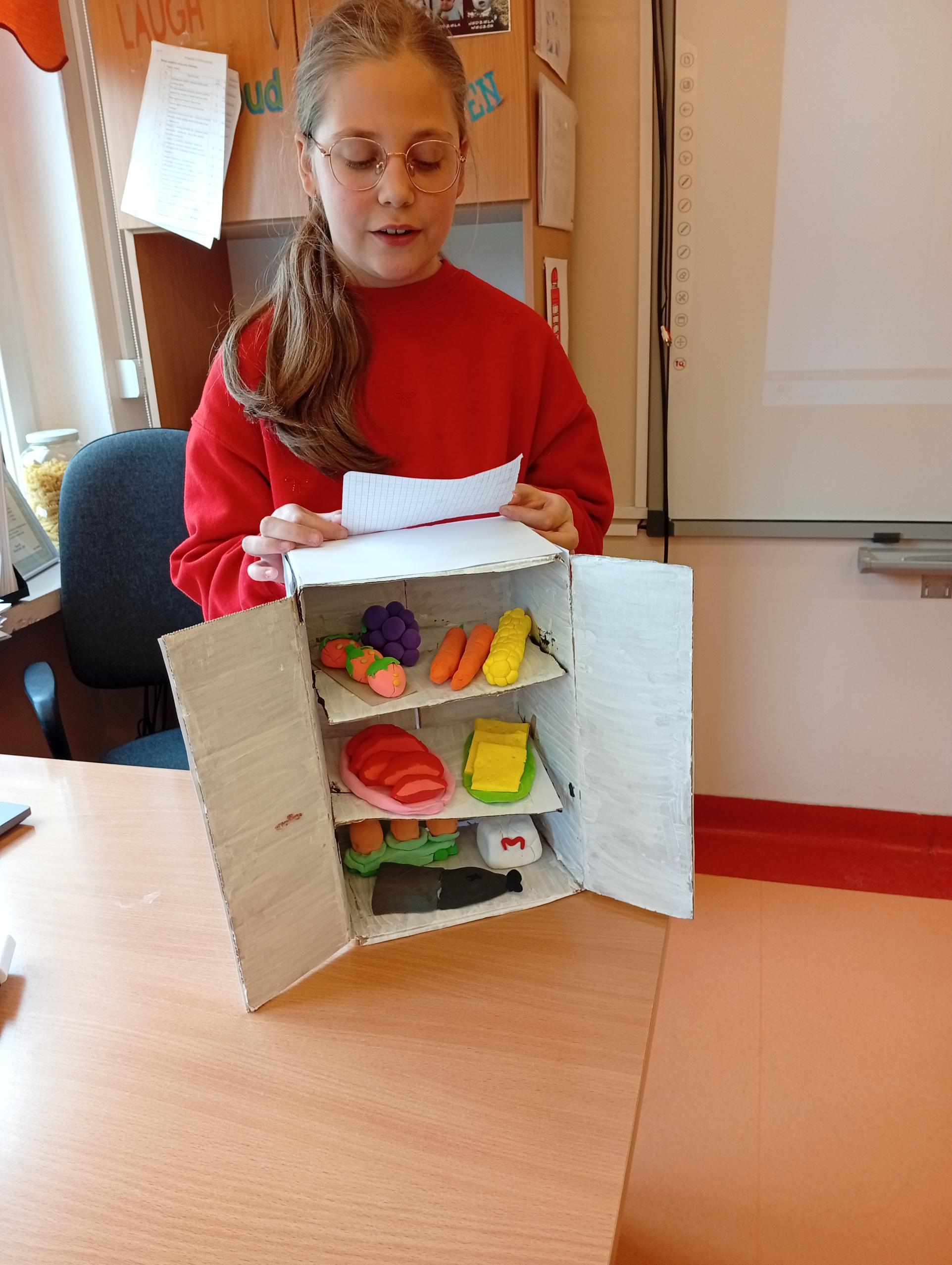 Uczniowie klasy 4b w zeszłym tygodniu na lekcjach języka angielskiego pracowali metodą projektu. Zadanie polegało na stworzeniu przestrzennej lodówki zawierającej różne produkty, a następnie opisanie jej z użycie odpowiednich konstrukcji gramatycznych. Uczniowie pracowali z zapałem, a wszyscy wykazali się dużą kreatywnością w tworzeniu lodówek oraz znajomością wielu nazw produktów spożywczych.
