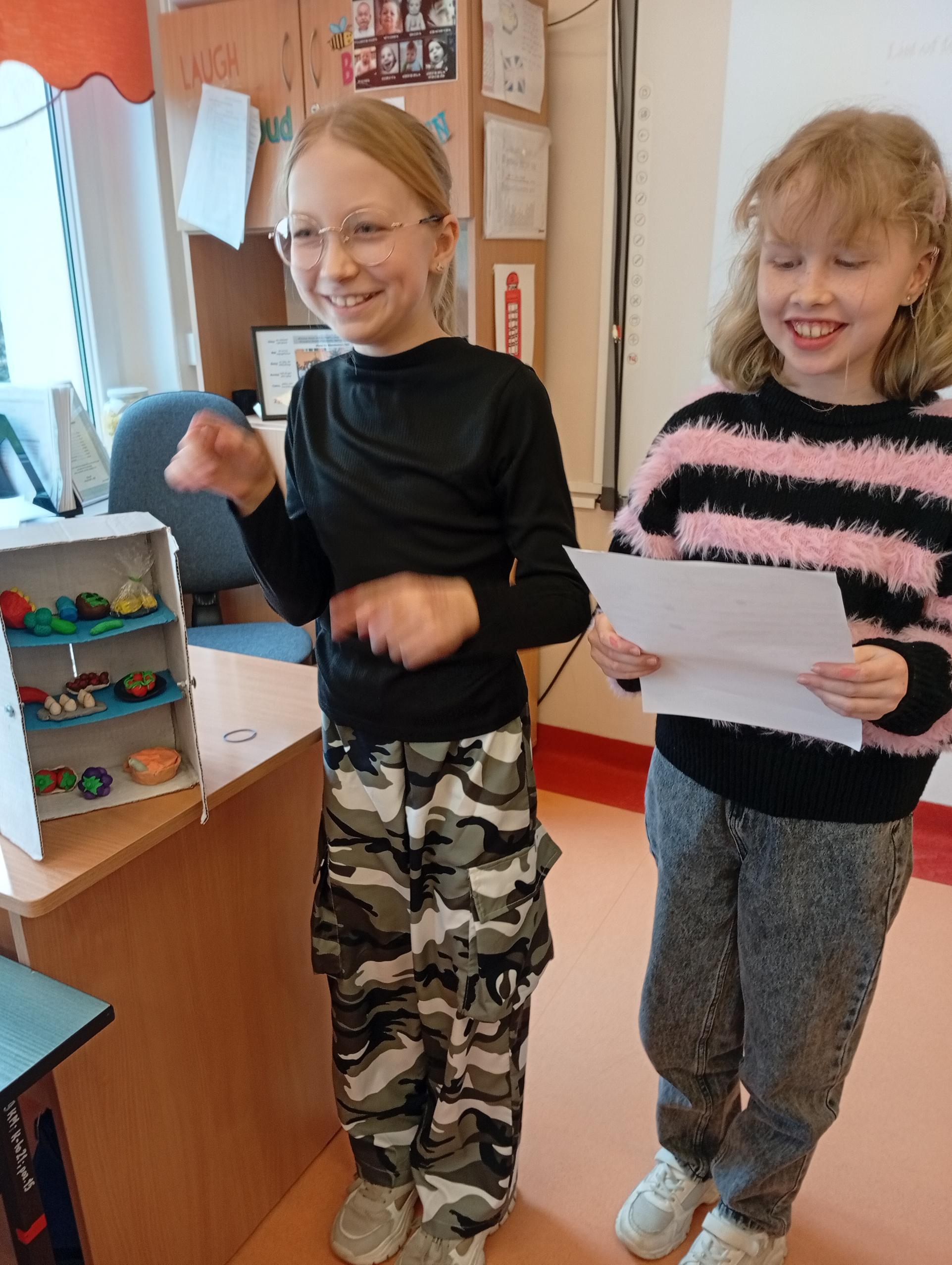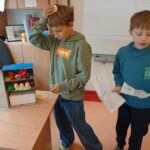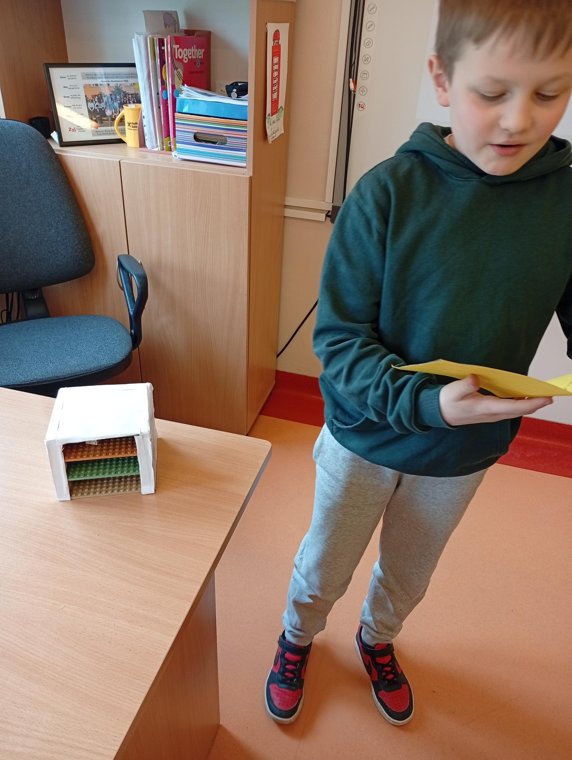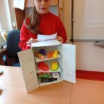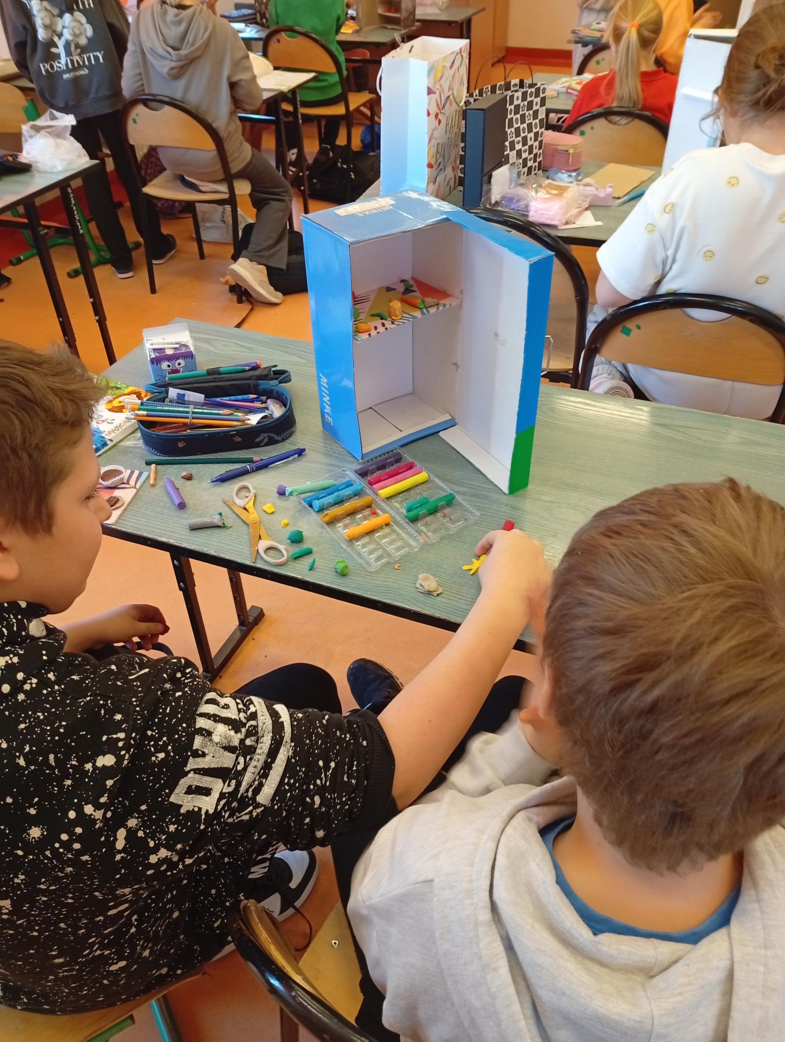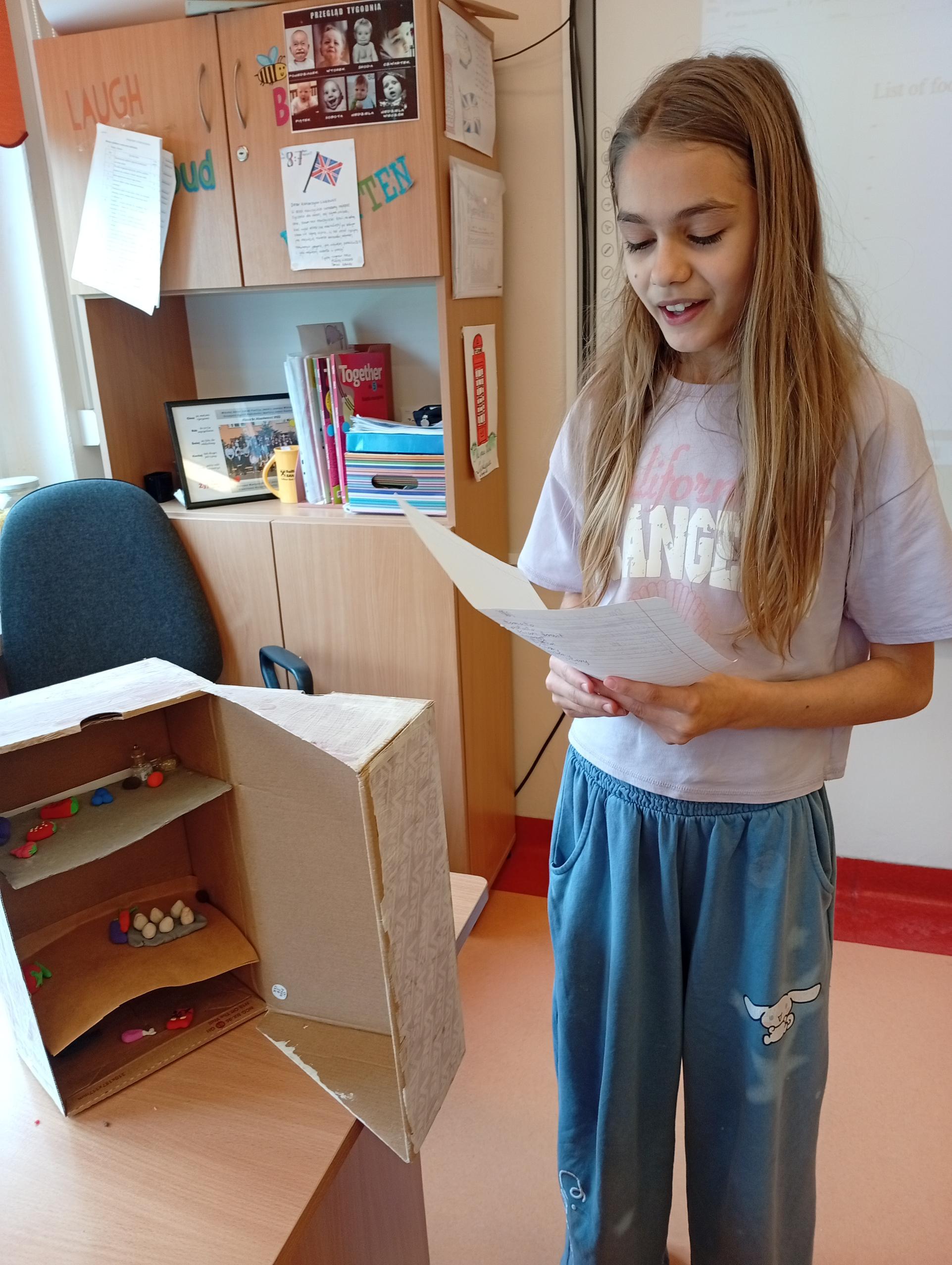 Uczniowie klasy 4b w zeszłym tygodniu na lekcjach języka angielskiego pracowali metodą projektu. Zadanie polegało na stworzeniu przestrzennej lodówki zawierającej różne produkty, a następnie opisanie jej z użycie odpowiednich konstrukcji gramatycznych. Uczniowie pracowali z zapałem, a wszyscy wykazali się dużą kreatywnością w tworzeniu lodówek oraz znajomością wielu nazw produktów spożywczych.