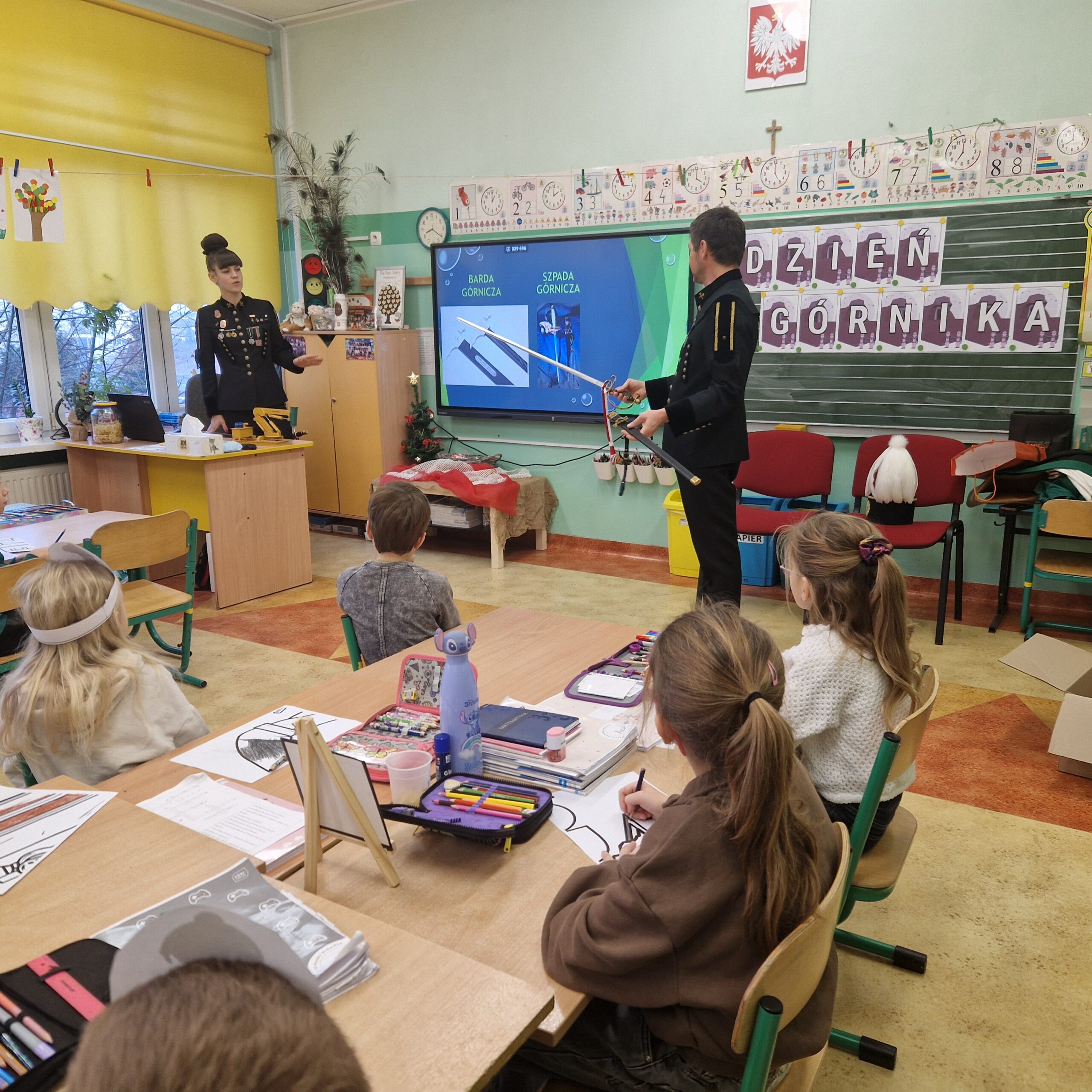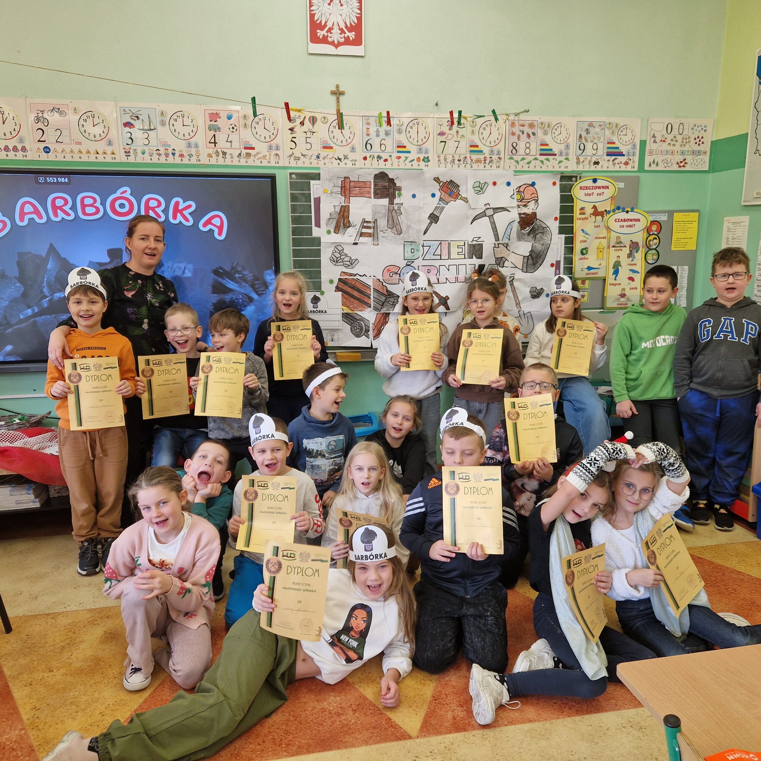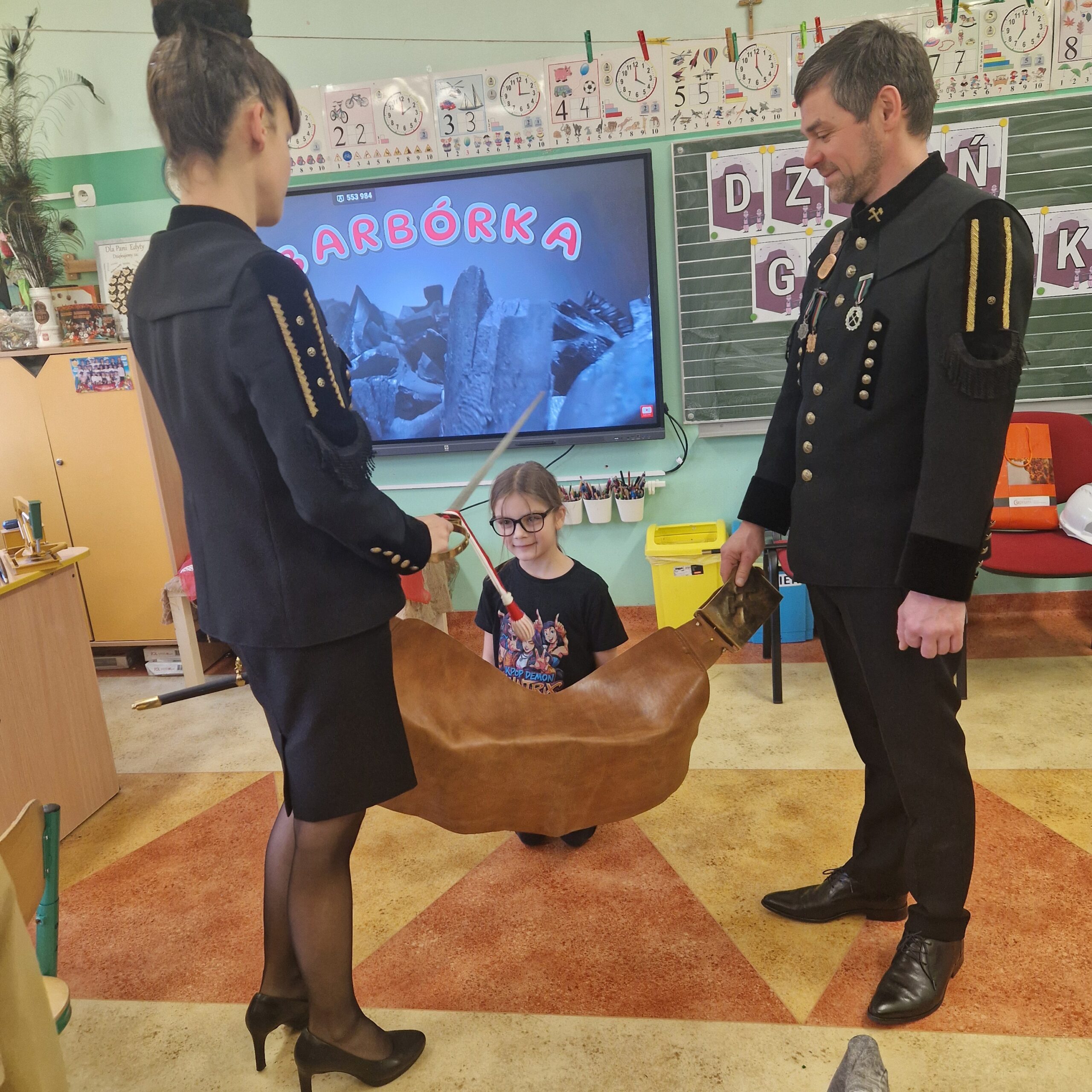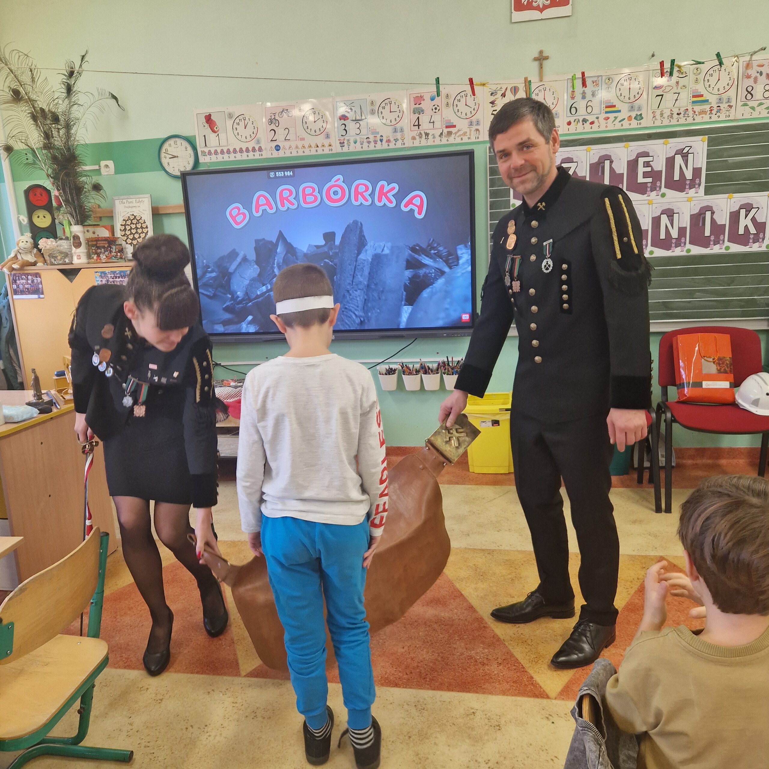 Dnia 04 grudnia klasę II B odwiedzili górnicy, wśród nich byli Państwo Joanna i Bartłomiej Dolmierscy, którzy pracują na co dzień w kopalni. Zaproponowali, że z okazji Dnia Górnika, przeprowadzą dzieciom ciekawą lekcję o naszym regionie a konkretnie o pobliskich kopalniach oraz ich codziennym funkcjonowaniu. Dzieci były zachwycone, przez całą lekcję z uwagą słuchali i oglądali ciekawe filmy o naszych regionalnych kopalniach miedzi. Na koniec fascynującej i ciekawej lekcji, dzieci miały okazję sprawdzić się w skoku przez skórę oraz być PASOWANYM na młodszego górnika, po skoku oraz pasowaniu uczniowie klasy II b, otrzymali DYPLOM MŁODSZEGO GÓRNIKA. Jesteśmy wdzięczni tym rodzicom, za to, że chcieli podzielić się swoją wiedzą na temat codziennej jakże ciężkiej pracy górnika w naszym regionie. Po wizycie rodziców jednego ucznia, postanowiliśmy przez resztę lekcji kontynuować temat w klasie.