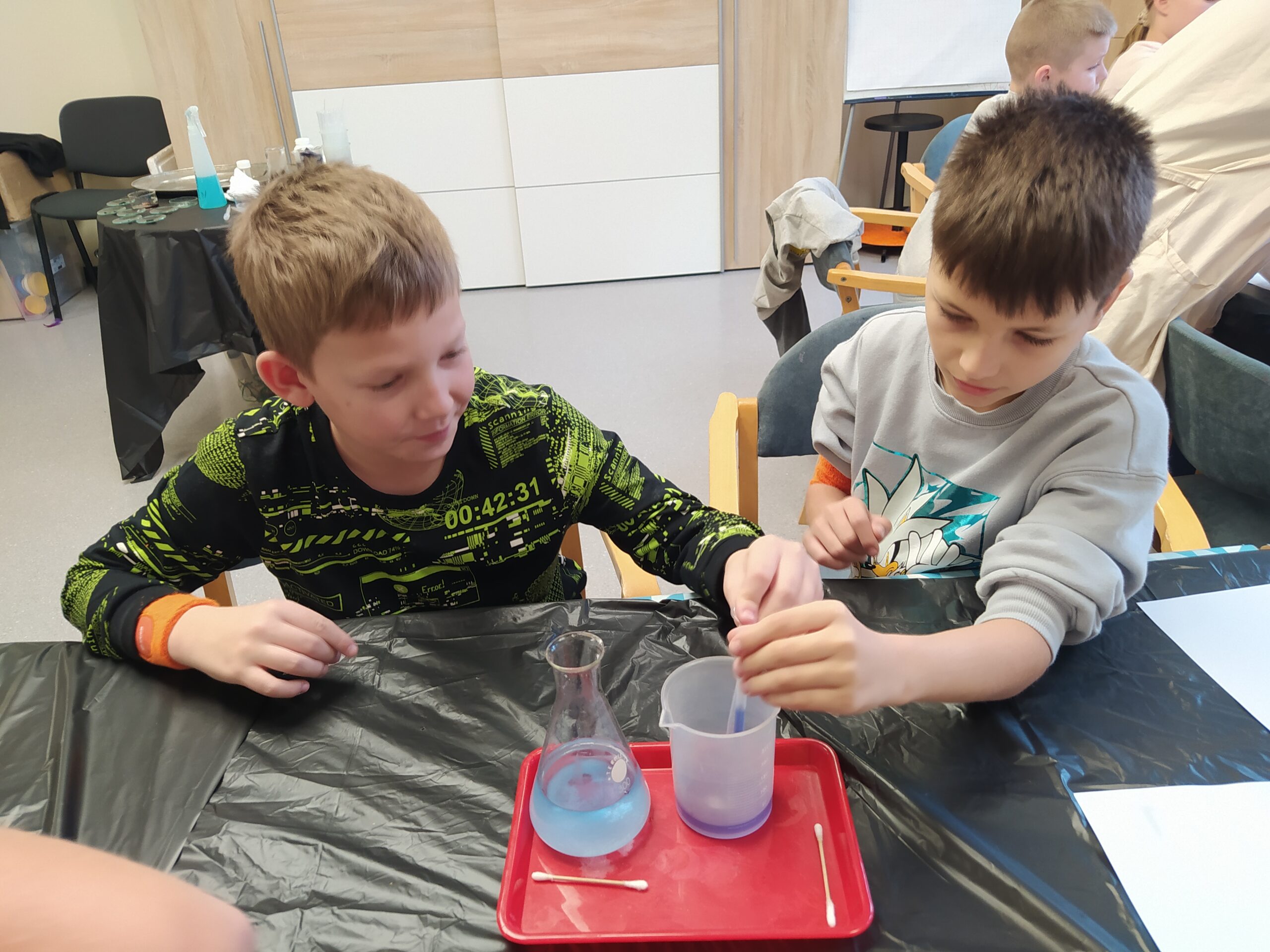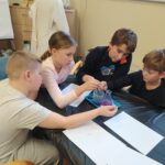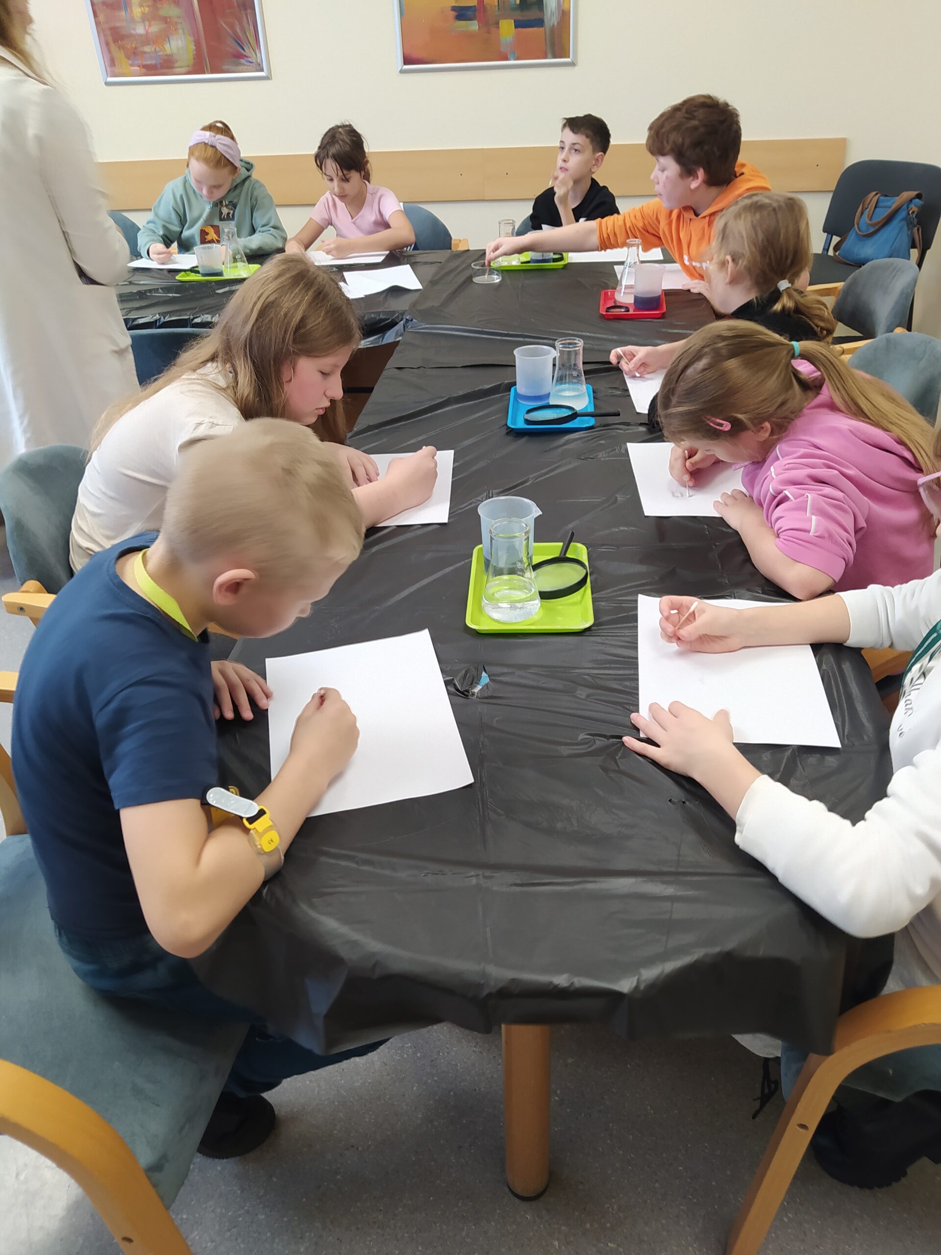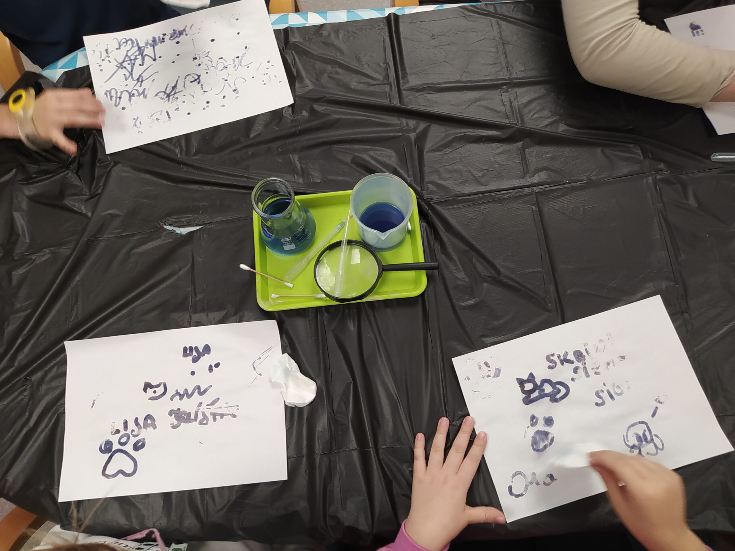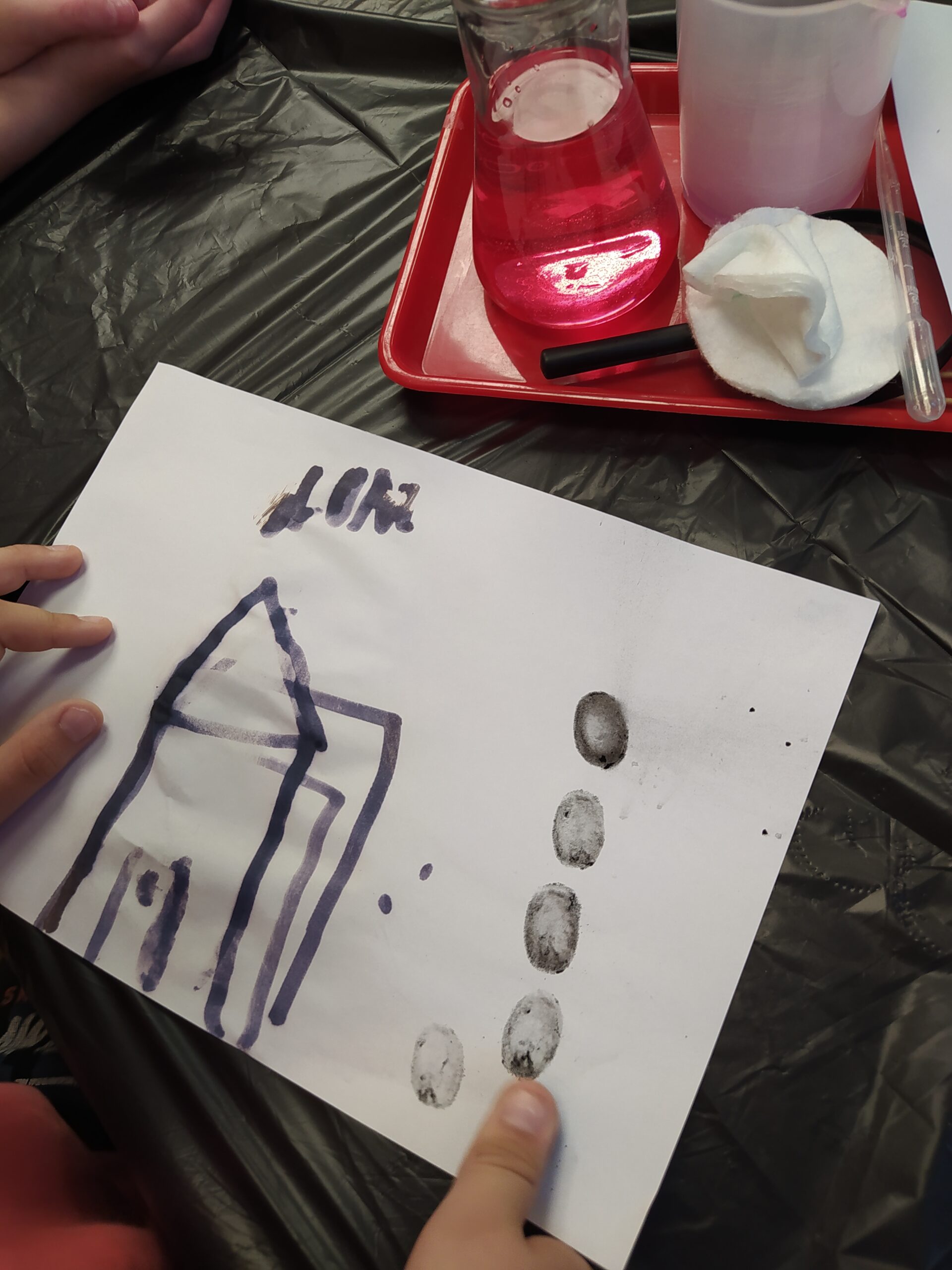 Na koniec odbyły się praktyczne warsztaty w „mini laboratorium detektywistycznym” przygotowane przez Uniwersytet Rozwoju. Wykonywaliśmy ciekawe eksperymenty, ucząc się m.in. odróżniania krwi sztucznej od prawdziwej, zdejmowania odcisków palców, tworzenia atramentów sympatycznych do pisania tajnych wiadomości oraz poznaliśmy jeszcze kilka innych trików detektywistycznych.