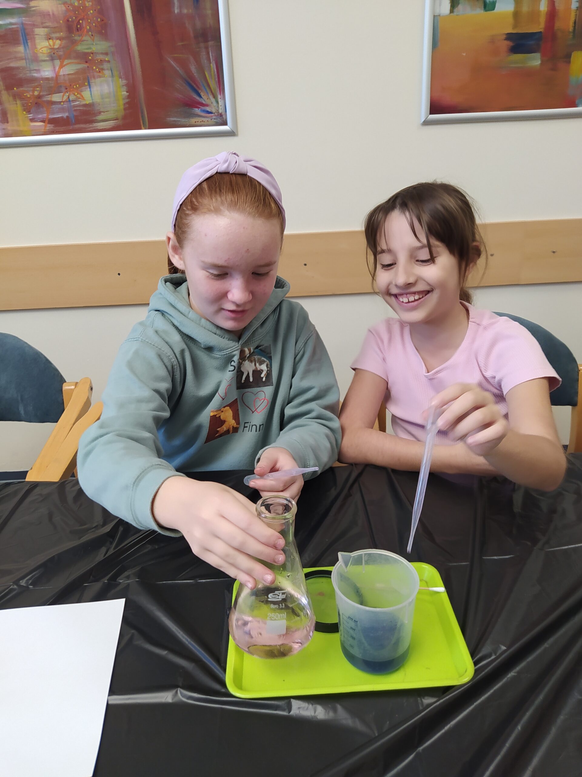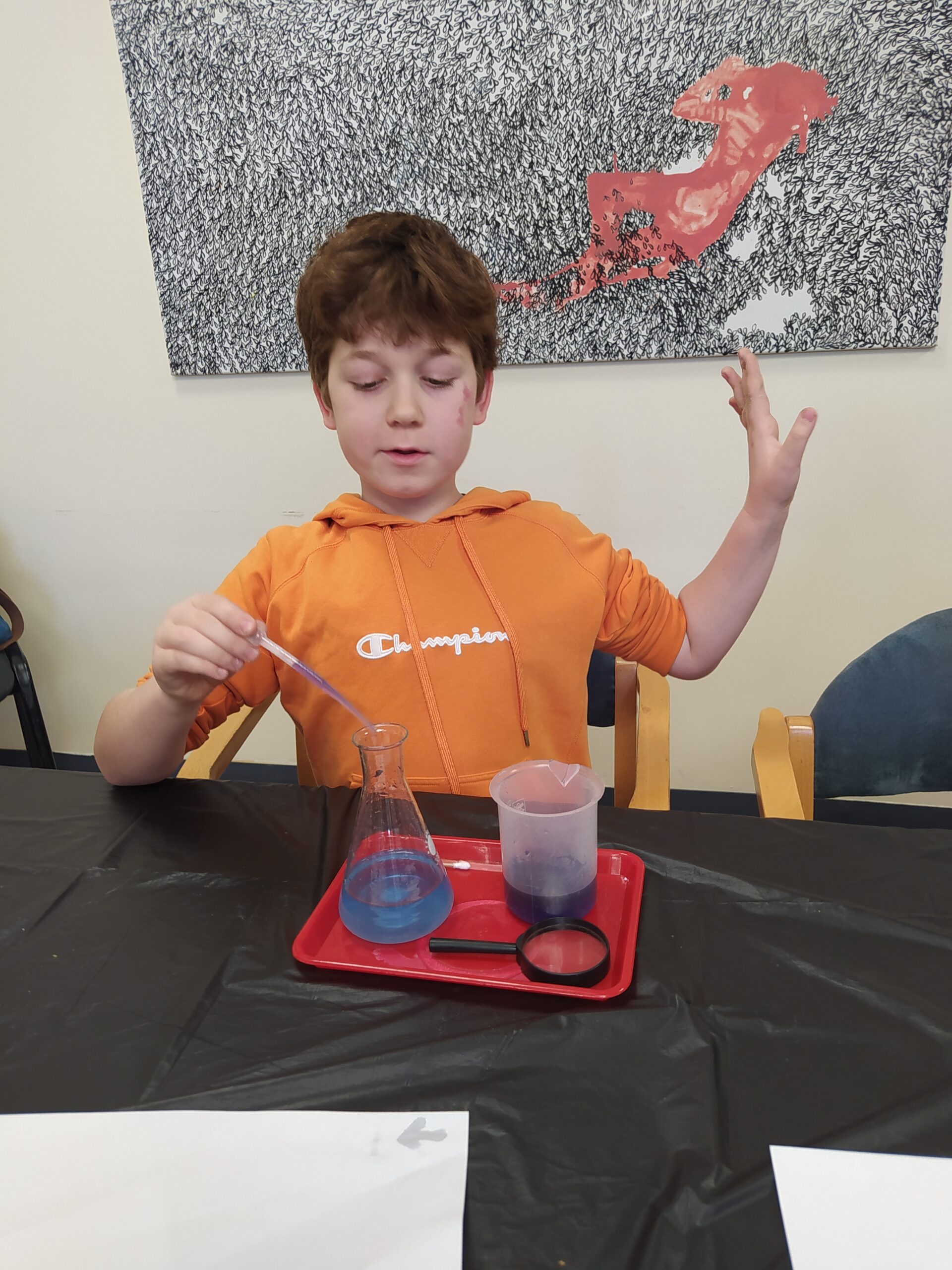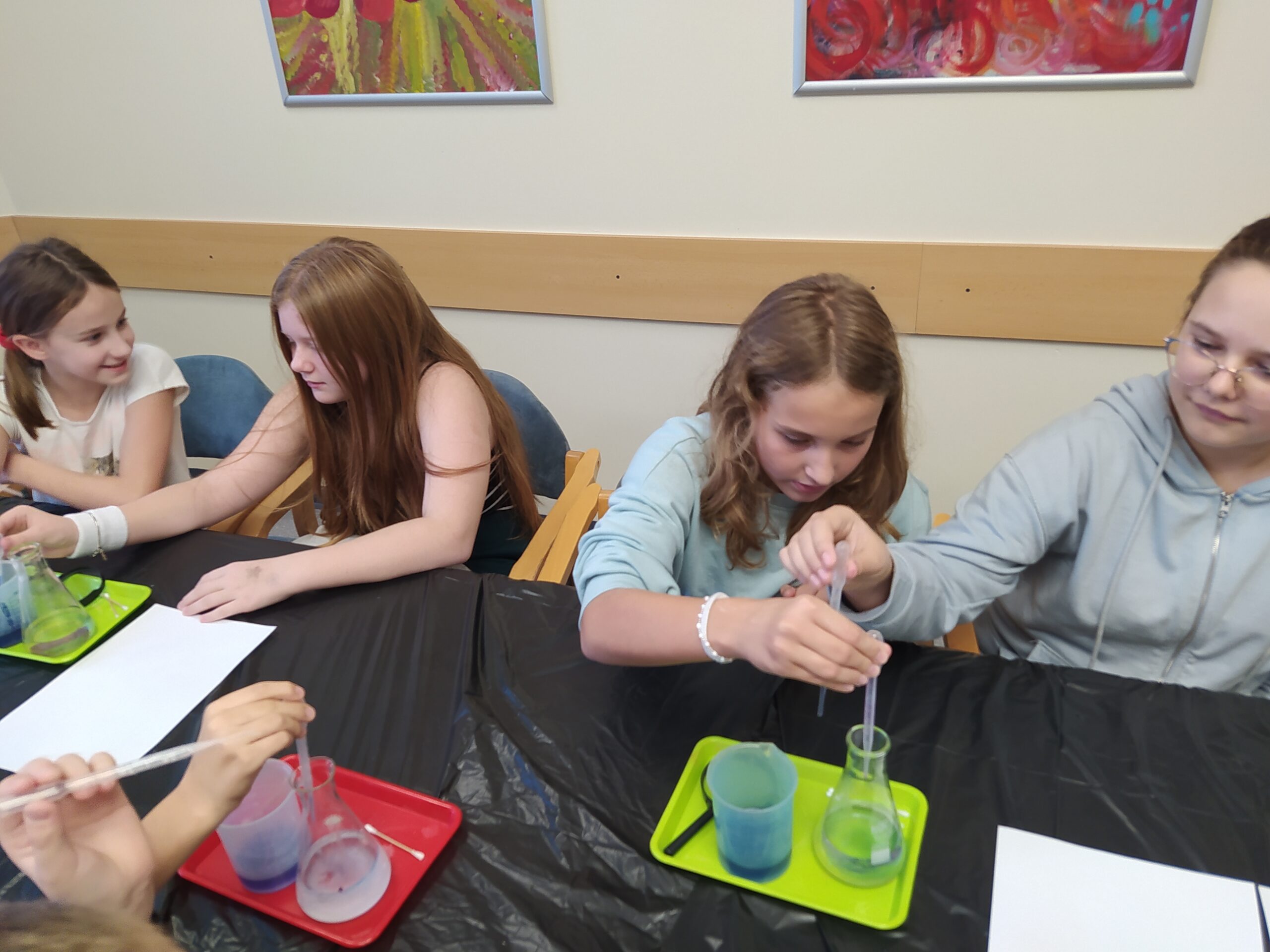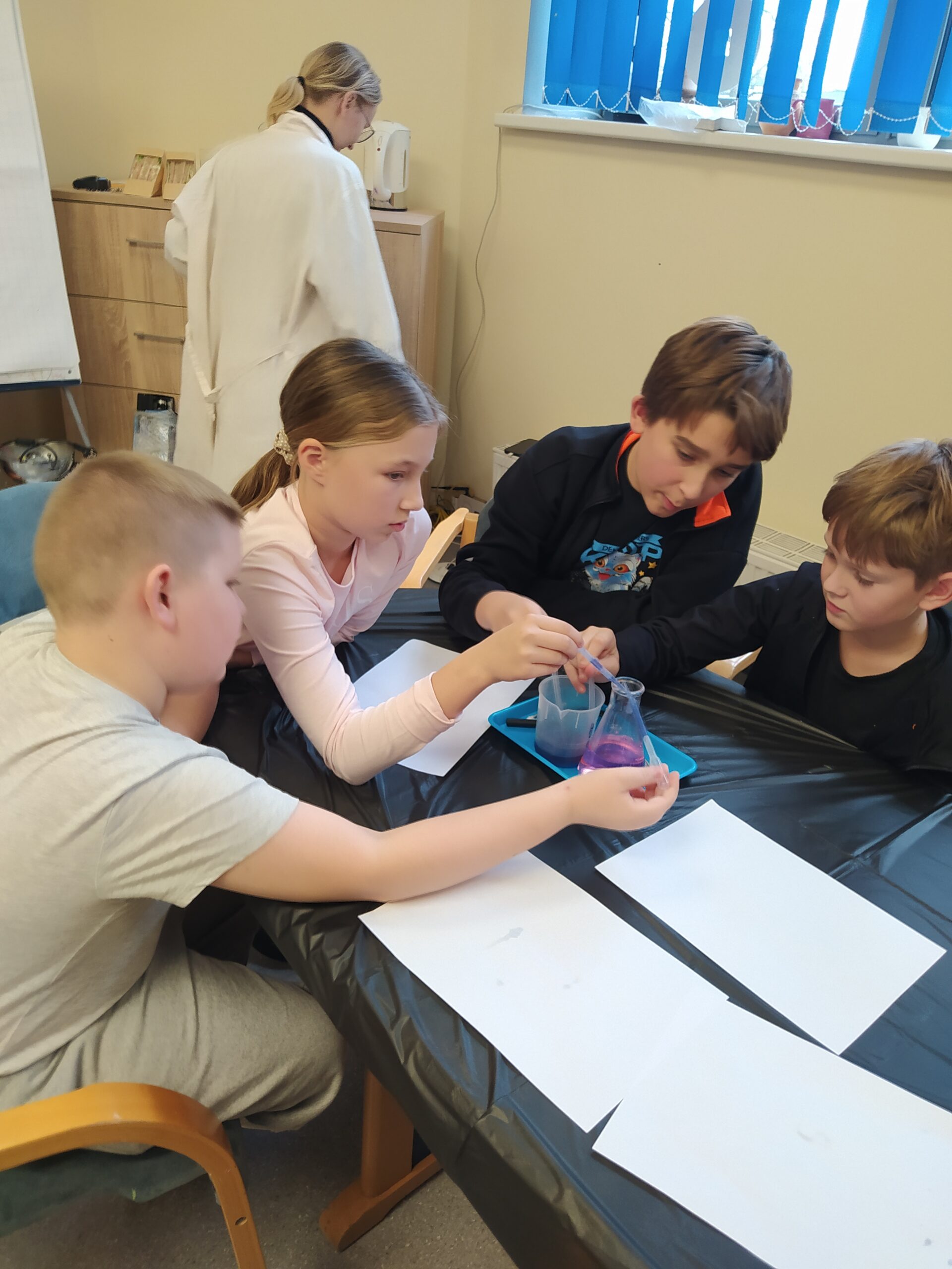 Na koniec odbyły się praktyczne warsztaty w „mini laboratorium detektywistycznym” przygotowane przez Uniwersytet Rozwoju. Wykonywaliśmy ciekawe eksperymenty, ucząc się m.in. odróżniania krwi sztucznej od prawdziwej, zdejmowania odcisków palców, tworzenia atramentów sympatycznych do pisania tajnych wiadomości oraz poznaliśmy jeszcze kilka innych trików detektywistycznych.