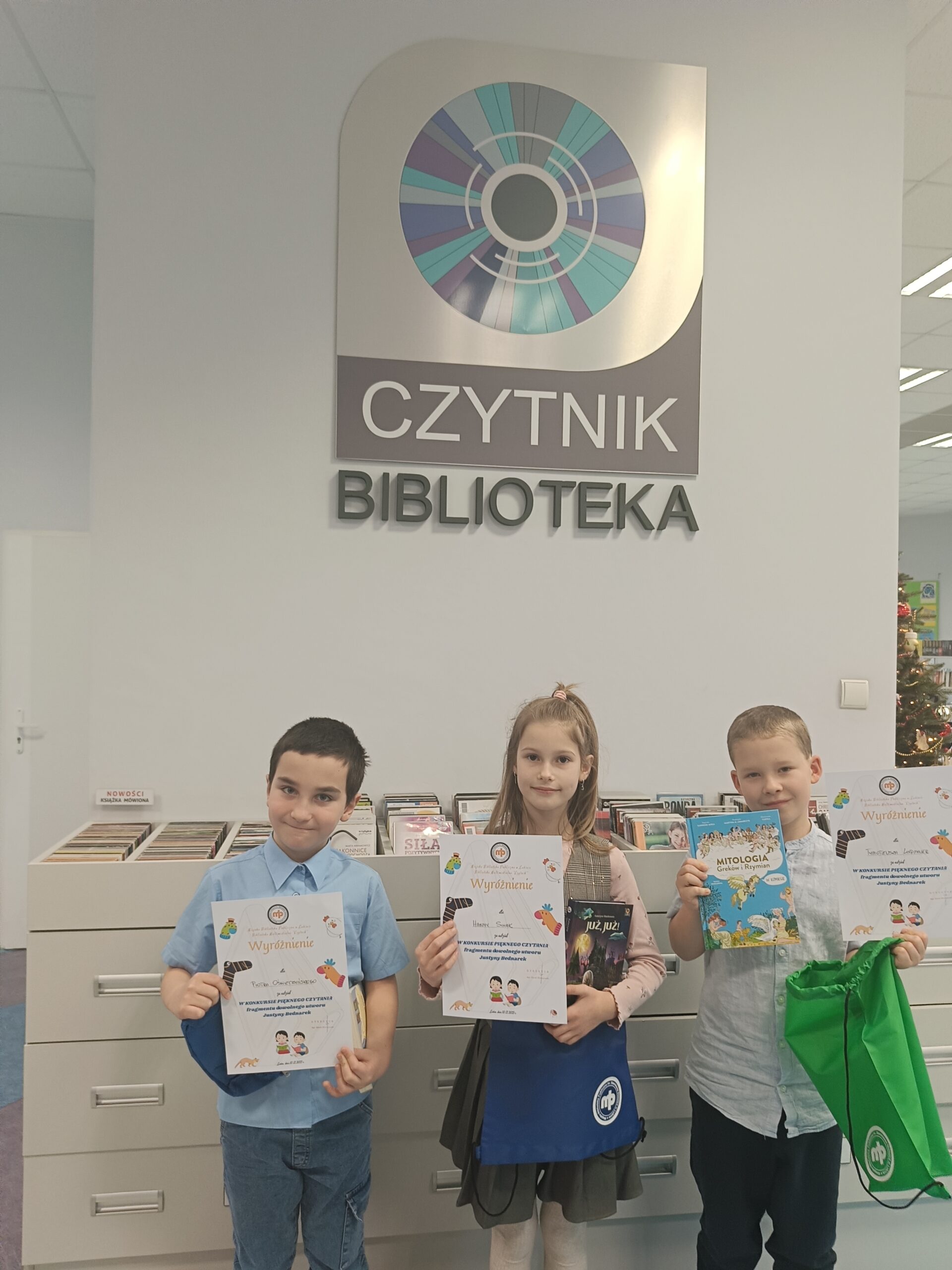 10 grudnia w bibliotece „Czytnik” odbył się międzyszkolny „konkurs pięknego czytania książek Justyny Bednarek”. Troje naszych reprezentantów: Hanna Siwak (3A), Tymoteusz Lindmajer 3B oraz Piotr Oswieczyński (3C) wzięło udział w konkursie, prezentując bardzo wysoki poziom umiejętności interpretacji tekstu. Uczniowie czytali płynnie, wyraźnie i poprawnie, z dbałością o intonację, akcent oraz tempo. Ich wystąpienia spotkały się z uznaniem jury i słuchaczy i zostały nagrodzone wyróżnieniami.