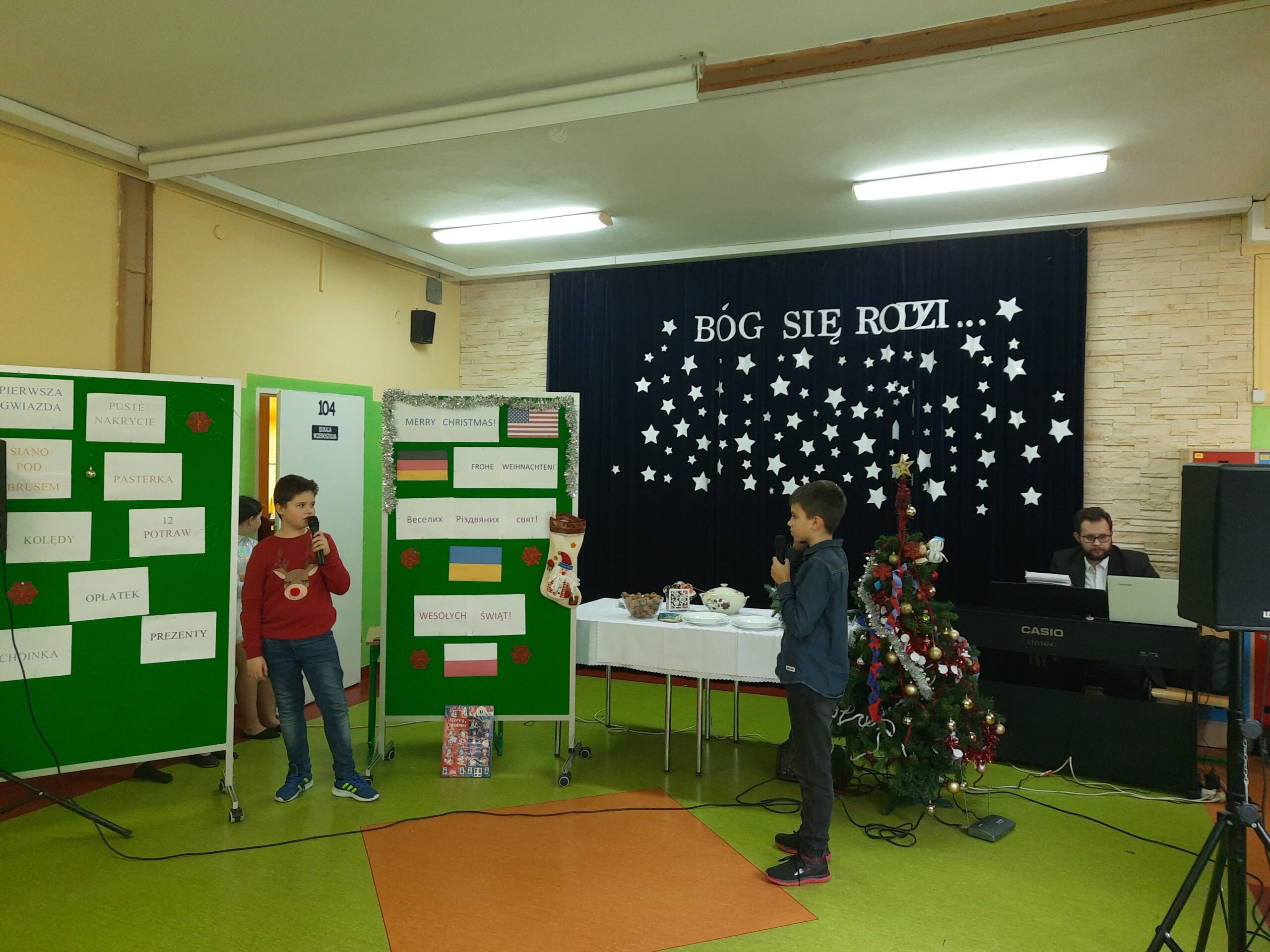 W dn.22.12.2022 w naszej szkole odbyło się przedstawienie ukazujące zwyczaje świąteczne w różnych krajach. Uczniowie mogli poznać rozmaite świąteczne tradycje oraz pogłębić znajomość polskich zwyczajów. Program artystyczny przeplatany był dialogami, wierszami ,kolędami i pastorałkami, a na koniec pojawiły się nastrojowe układy taneczne. Przedstawienie wprowadziło zebranych w świąteczny klimat, a uczestnicy zebrali od widowni zasłużone brawa.