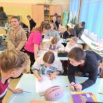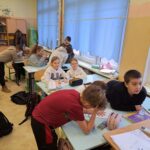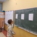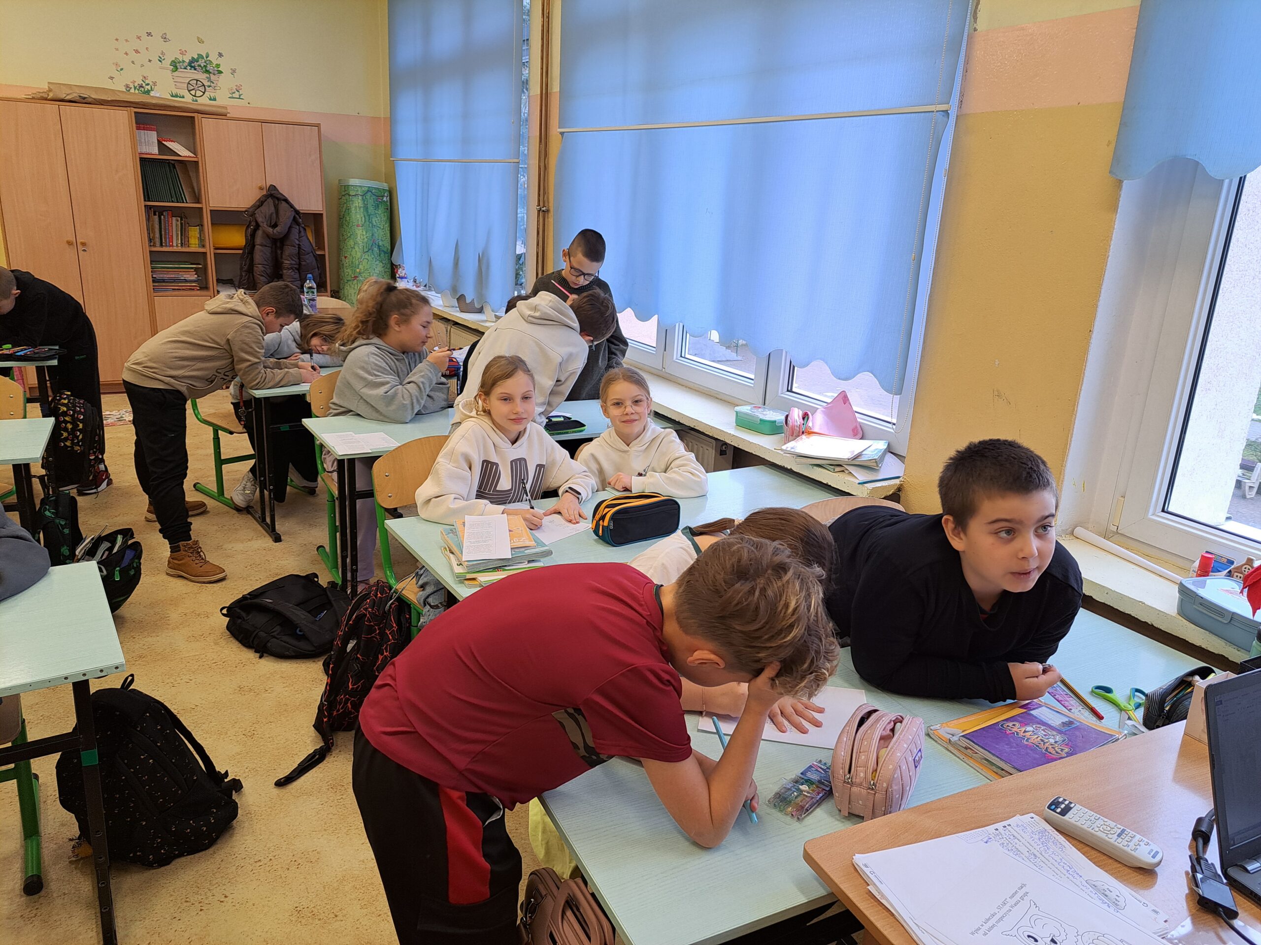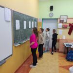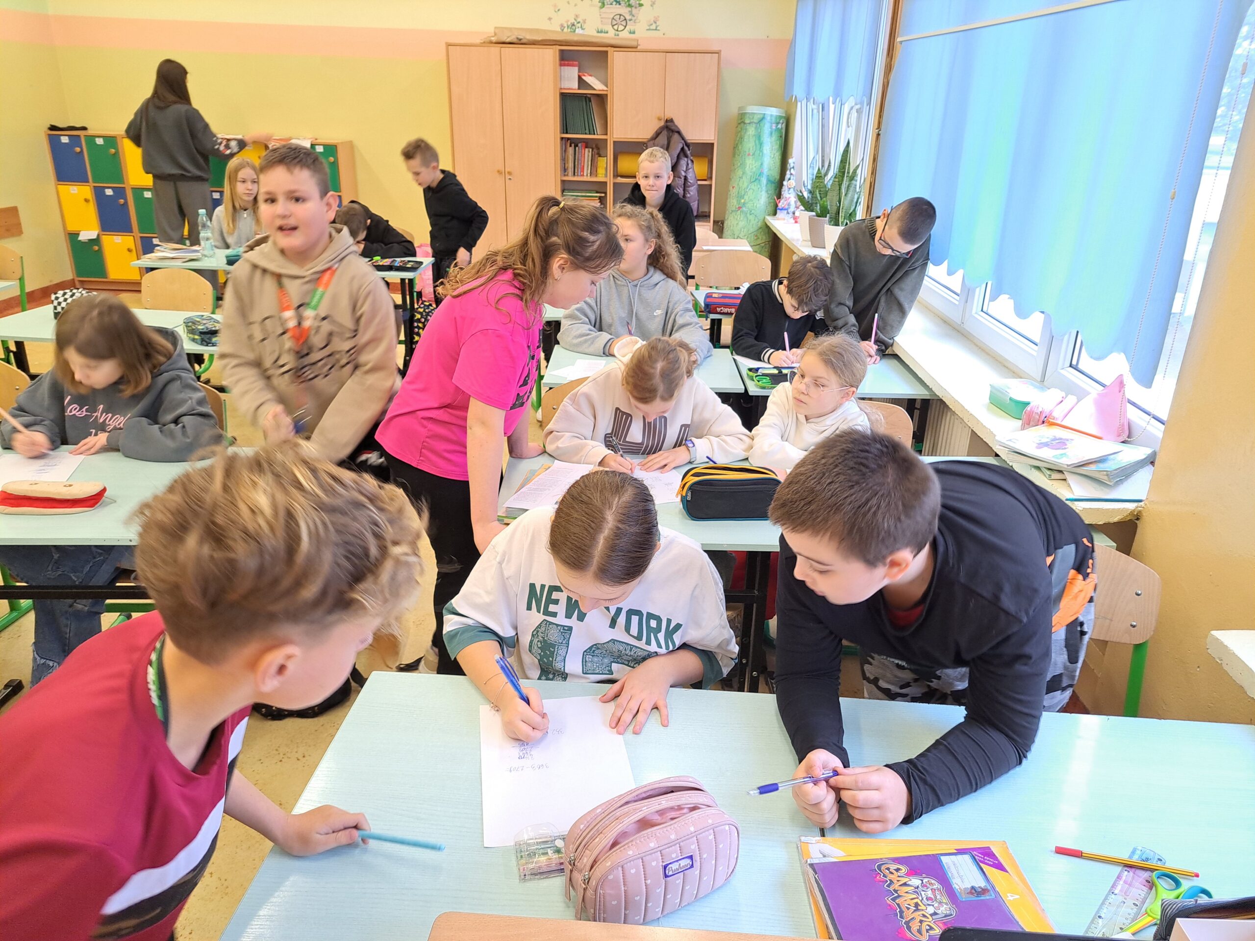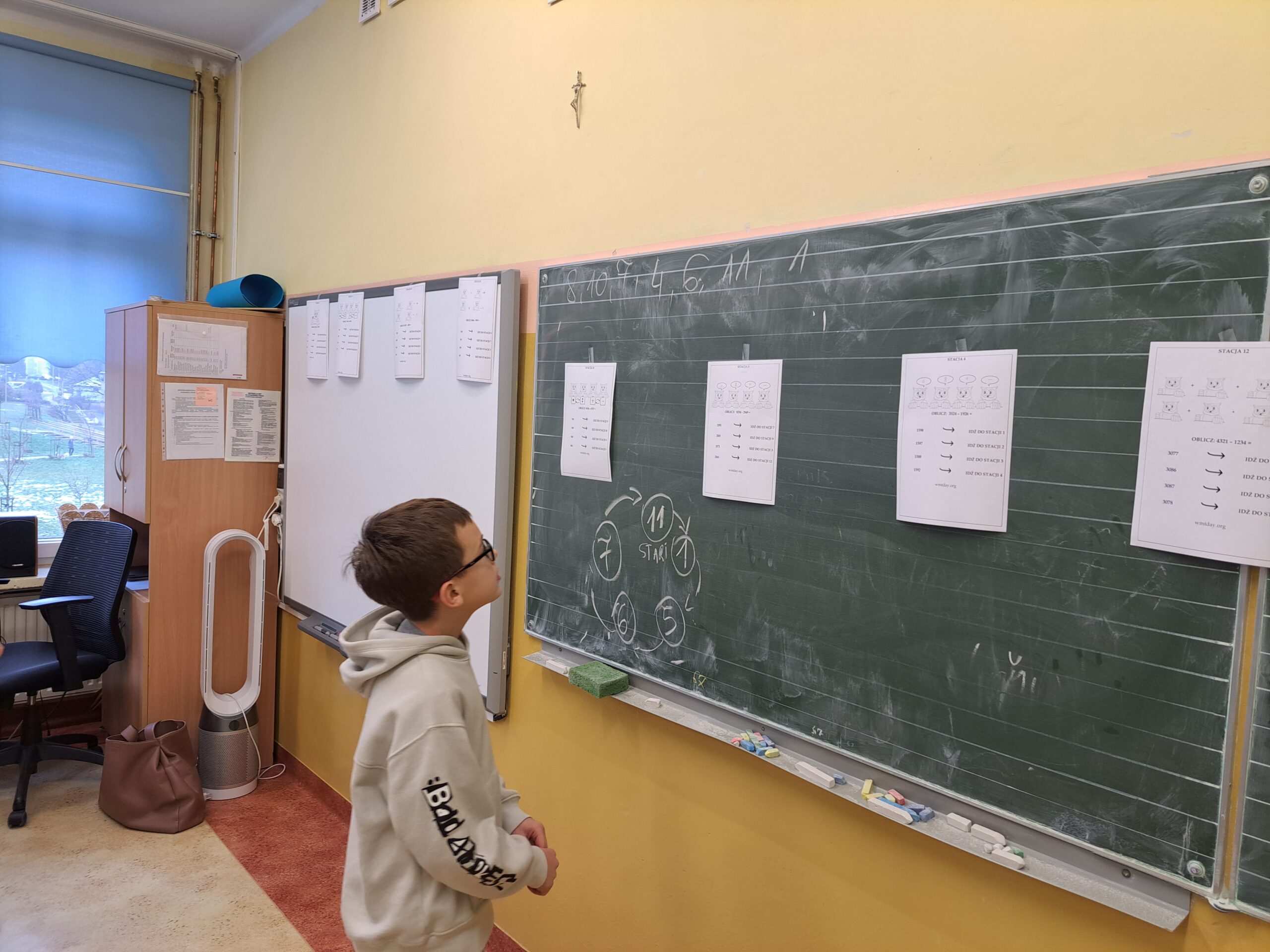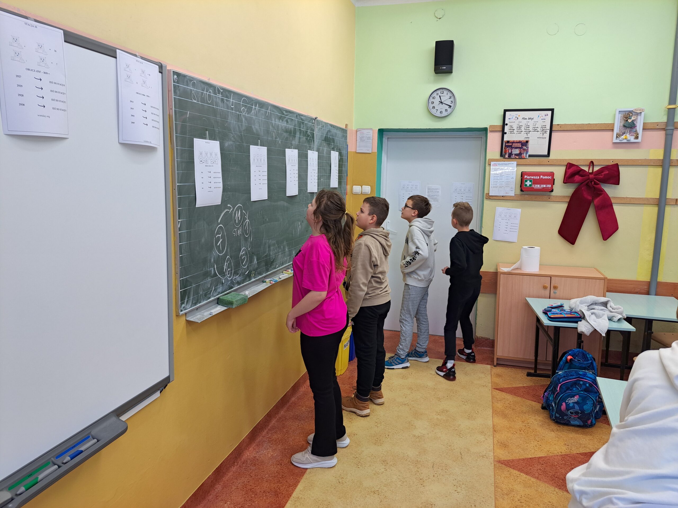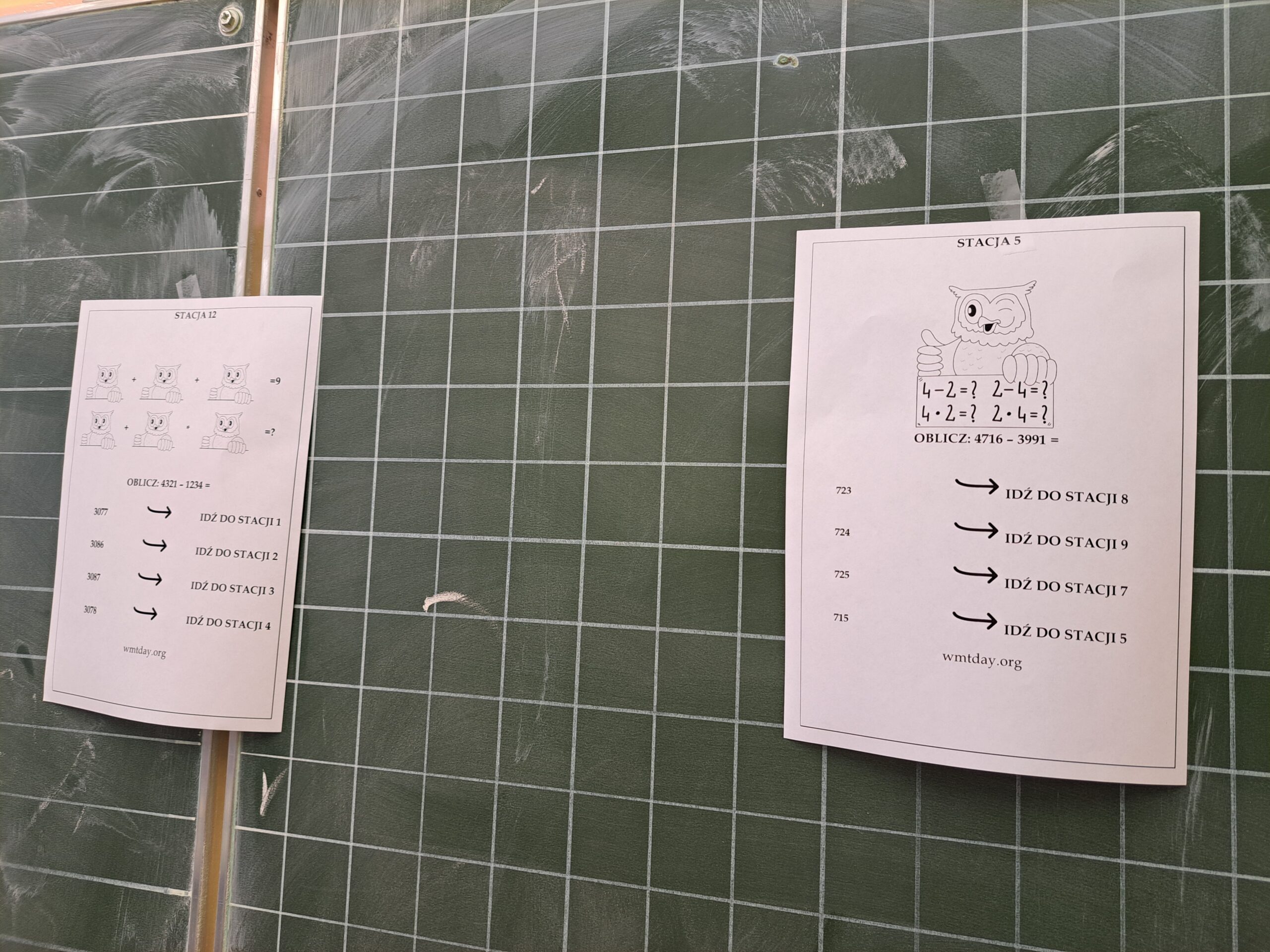 Zaraz po rozpoczęciu zajęć na tablicy i na ścianach pojawiły się kartki z działaniami. Uczniowie mieli za zadanie stworzyć grupy, w których każdy z nich miał swoją określoną rolę : gońca i intelektualisty. Goniec miał odnaleźć prawidłowy numer zadania i przekazać przykłady intelektualiście – ten zaś, obliczyć działanie.